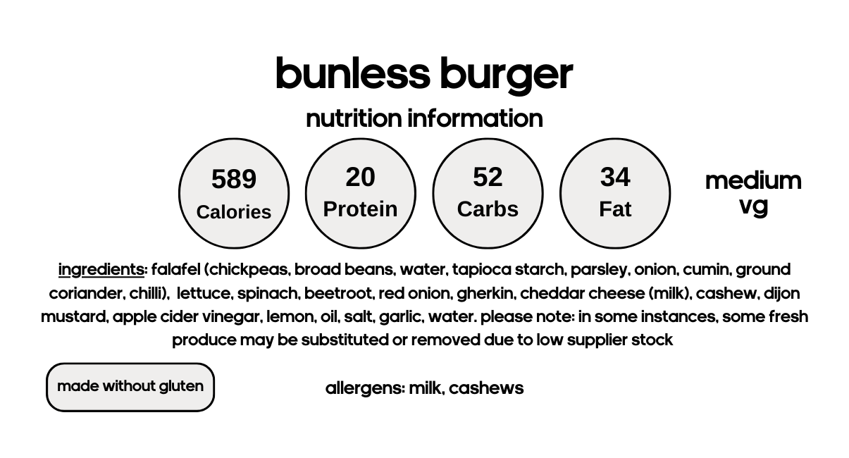 Satisfy your cravings with our Bunless Falafel Burger! Made with a moist falafel with a little spice, this bun-free burger is perfect for those looking for a low-carb option. Enjoy all the flavor without the guilt.